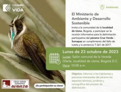 ¡Tu voz cuenta en la delimitación del páramo de Sumapaz! Invitamos a la comunidad a participar en la reunión informativa para la delimitación participativa del páramo de Sumapaz. Te esperamos el próximo lunes 23 de octubre. ¡Juntos cuidamos nuestro entorno natural!
