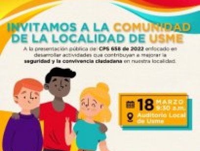 Invitamos a toda nuestra comunidad usmeña a la presentación del contrato CPS 658 de 2022 enfocado en mejorar la seguridad y la convivencia ciudadana este 18 de marzo. 9:00 a.m. Auditorio Alcaldía Local de Usme Te esperamos.