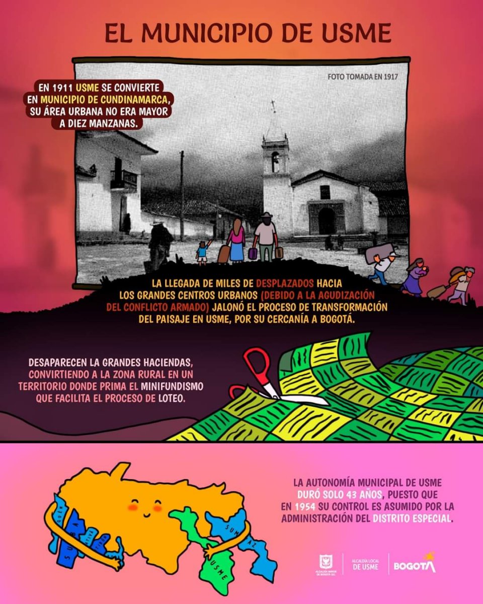 Sabíasque en 1911 Usme se convierte en municipio de Cundinamarca y se vuelve una zona importante que abasteció recursos para la urbanización. La autonomía municipal de la localidad duró solo 43 años, ya que en 1954 su control es asumido por la administración del Distrito Especial.