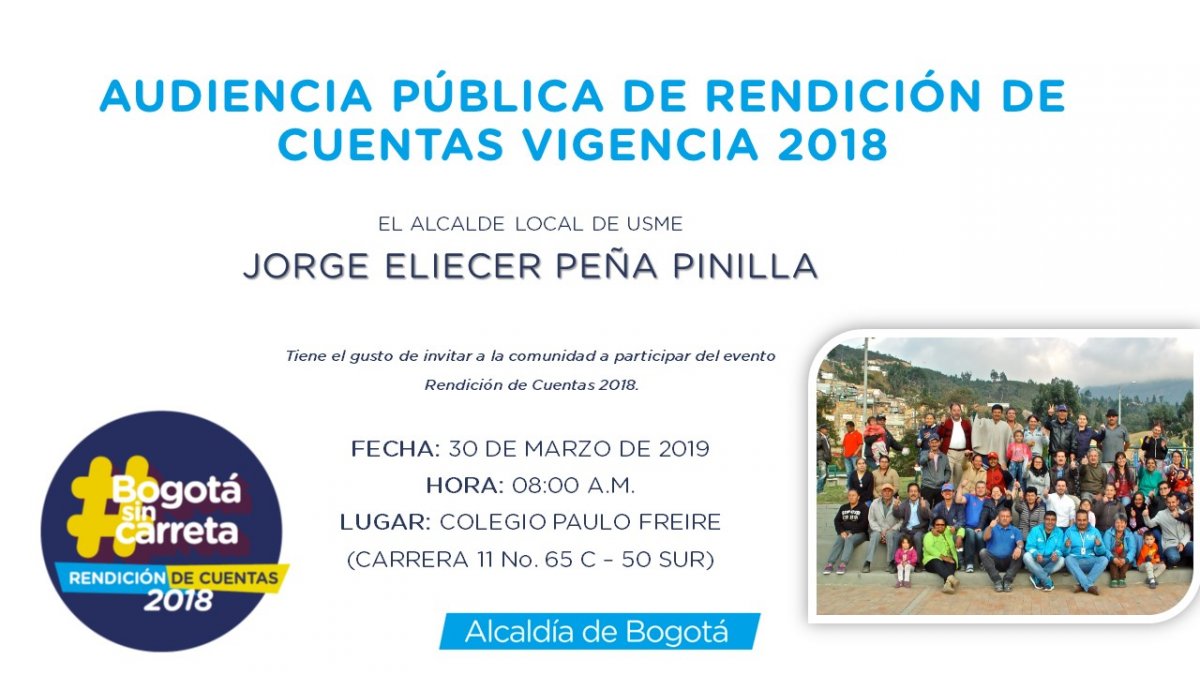 La Alcaldía Local de Usme se complace en invitar a la comunidad de la Localidad a participar en el informe de Rendición de Cuentas que se realizará el día 30 de marzo de 2019, el evento se llevará a cabo en el Colegio Paulo Freire ( Carrera 11 No 65c - 50 SUR) a las 8:00 a.m. contará con la presencia de la Veeduría Distrital, los Ediles de la Localidad y los presidentes de las Juntas de Acción Comunal de los diferentes barrios.