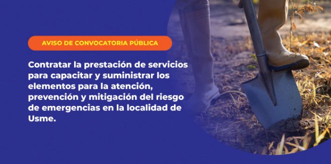 CONTRATAR LA PRESTACIÓN DE SERVICIOS PARA CAPACITAR Y SUMINISTRAR LOS ELEMENTOS PARA LA ATENCIÓN, PREVENCIÓN Y MITIGACIÓN DEL RIESGO DE EMERGENCIAS, EN EL MARCO DEL PROYECTO 1806: ACCIONES PARA EL MANEJO DE EMERGENCIAS Y DESASTRES DE LA LOCALIDAD DE USME.