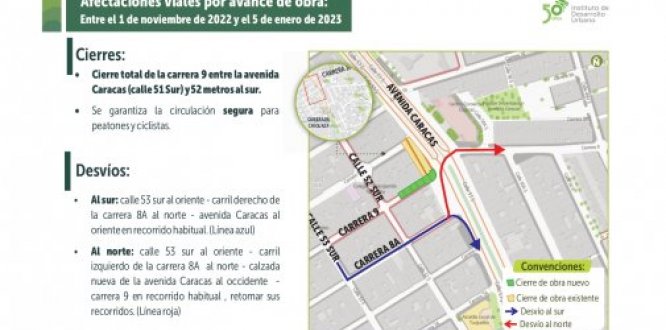 #IDUEnObra | tendremos cierres para adelantar actividades constructivas, asociadas al proyecto de la extensión de la avenida Caracas, entre la estación Molinos y el Portal Usme, que beneficiará a más de 870 mil personas que transitan por este corredor.Los cierres están programados hasta el cinco de enero del próximo año. La carrera 9 estará cerrada totalmente hacia el sur, a partir de la avenida Caracas (calle 51 Sur) por 52 metros. La circulación de peatones y ciclistas estará garantizada. ¡Toma nota y transita adecuadamente!