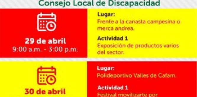 Desde el Consejo Local de Discapacidad de la Alcaldía Local de Usme, se llevará a cabo el 10° Festival Movilízate por las Discapacidades el próximo 29 y 30 de abril en nuestra localidad usmeña, con el fin de hacer visible este segmento poblacional, donde se reconocerán sus aportes en ámbitos creativos, empresariales, artísticos y deportivos.