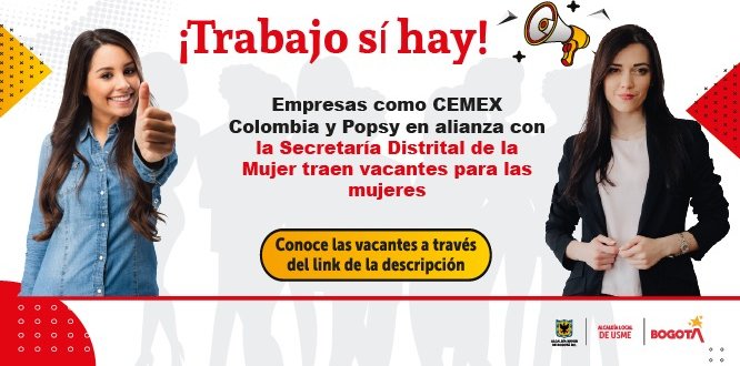Como parte de las estrategias de reactivación económica de la Alcaldía Mayor, la Secretaría Distrital de la Mujer comparte ofertas laborales de empresas.